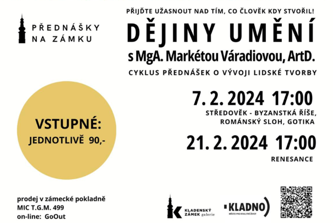 Ponořte se snámi do příběhů výtvarného umění od jeskynního malířství přes umění starého Egypta a činorodou renesanci až po modernu. V Kladenském zámku se můžete již od 10. ledna na přednáškách pravidelně setkávat s úspěšnou lektorkou Markétou Váradiovou. Přihlásit se můžete na celý program s názvem Dějiny umění na zámku nebo přijít jen na vybrané přednášky.