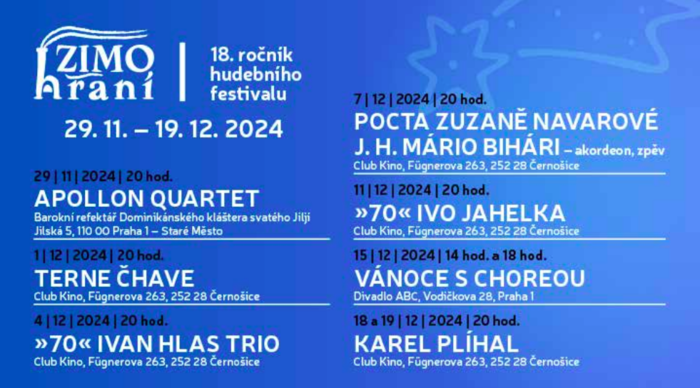 Hned 1. prosince se poprvé na Zimohraní představí nejstarší fungující česká romská kapela, držitelka ocenění Anděl, Terne Čhave. Její tvorba zahrnuje různé styly od folku přes world music až po styl, který si příznačně nazvali Rom'n'Roll.